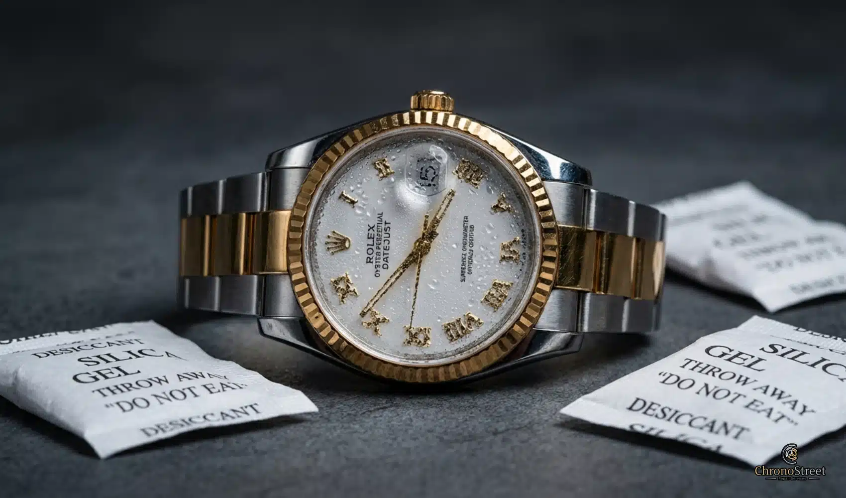 To dry a foggy Rolex dial immediately, pull the winding crown out to the furthest position (time-setting mode). Place the watch in an airtight container or Ziploc bag filled with silica gel packets. Leave it sealed for at least 24 to 48 hours. This draws the moisture out through the open crown tube.